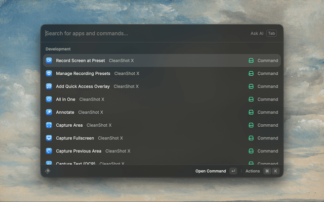 5. Once installed, you will find various commands under the CleanShot X Extension in Raycast.