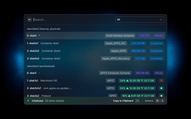 The usage is fairly intuitive. Each disk has multiple actions in Raycast which are self-explanatory and change based on the type and status of the disk/volume. Just try it!
