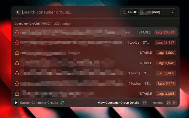 This extension connects to your Kafka UI instances and provides quick access to consumer group lag monitoring and topic browsing directly from Raycast.