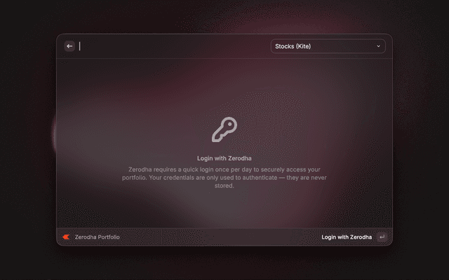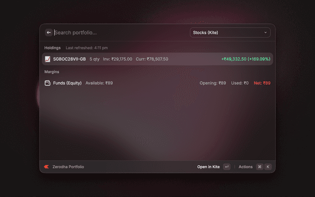 Open Raycast, search for "Zerodha Portfolio", and see your: