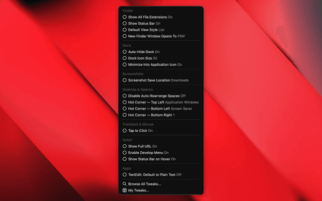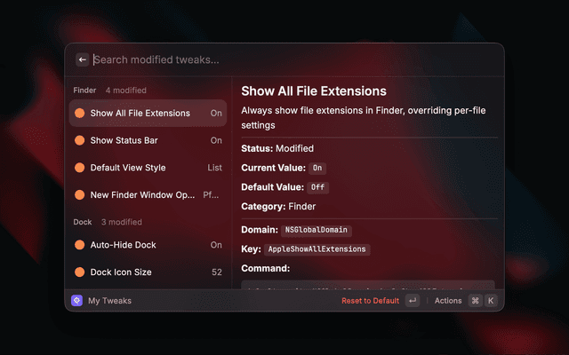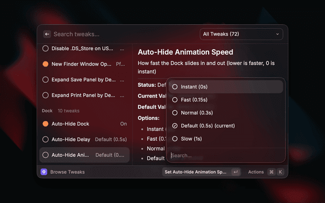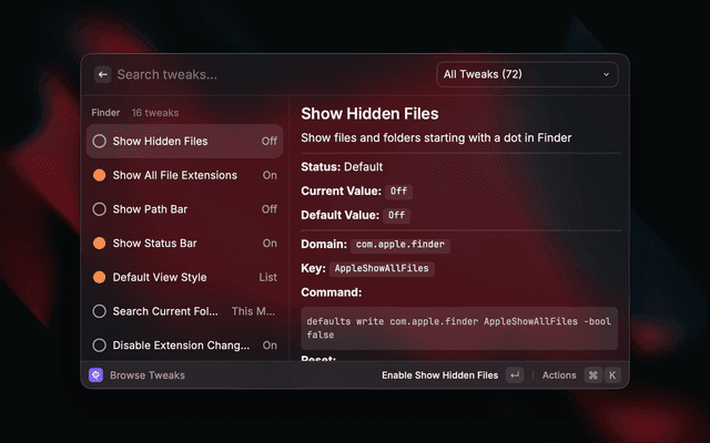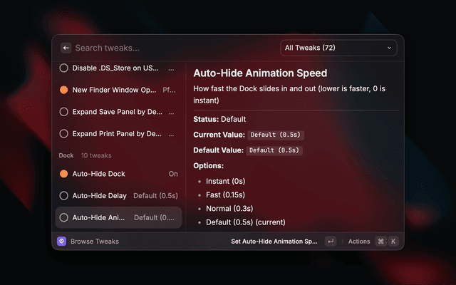 Discover and toggle hidden macOS settings without the Terminal. Browse a curated catalog of defaults write tweaks for Finder, Dock, Screenshots, Animations, and more.