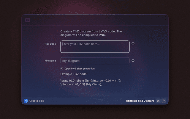 • πŸ€– AI Tool Integration: Generate TikZ diagrams directly from Raycast AI chat