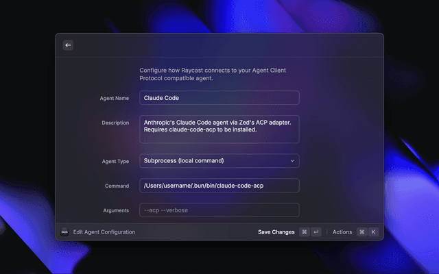 Connect to AI agents via Agent Client Protocol for coding assistance directly from Raycast.