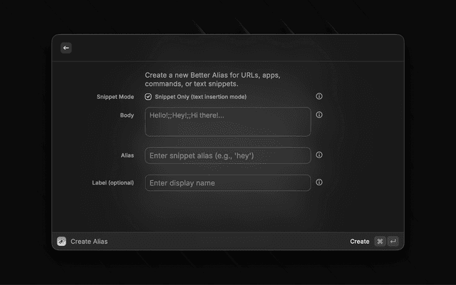 Better Aliases is an opinionated aliases and randomized snippets. Raycast in Raycast.