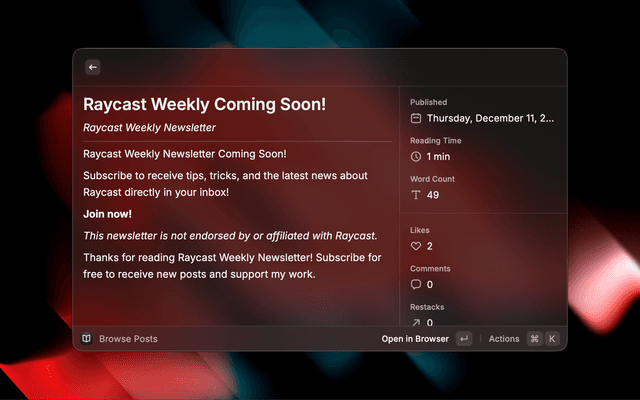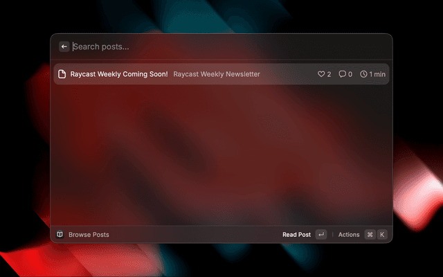 • In-Depth Reading: Read full posts in a clean, markdown-rendered view within Raycast.