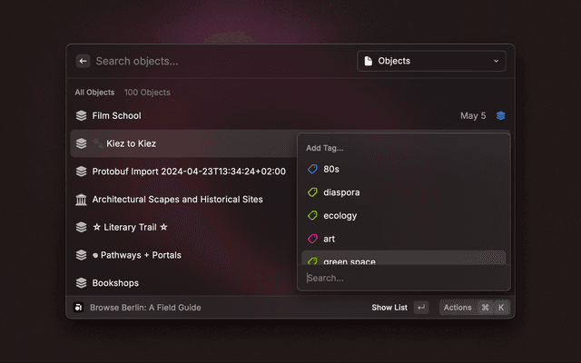 Space and Type of object (e.g., Bookmark, Note, Task).