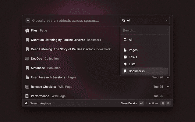 - Open: Use Command + Enter to instantly open the currently selected space or object in Anytype.
