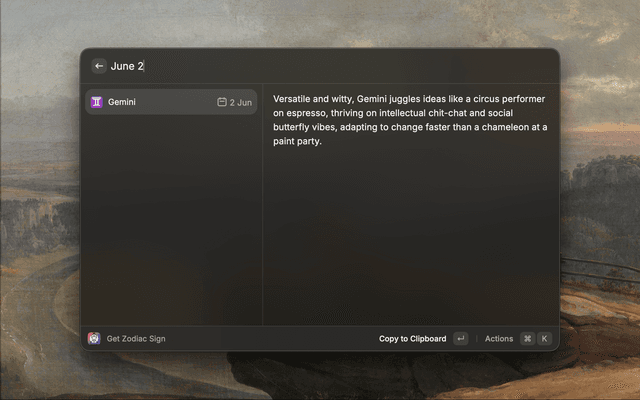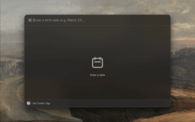 Zodme is a Raycast extension that converts a birth date into its zodiac sign and shows a short description of the sign’s archetype.