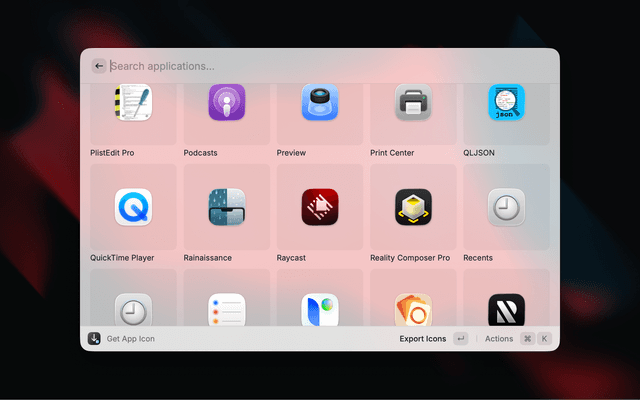 ⌘G / ⌘L.~/Downloads/..icns file). Multiple formats can be enabled at once.⌘E): Exports all enabled sizes to the app's folder in the configured formats.⌘⇧E): Exports every size (16–1024) regardless of preferences, as a one-off.⌘⇧C): Copies the app icon at the largest enabled size to the clipboard as an image. You can paste it directly into design tools, documents, or chat apps.⌘.): Copies the full path to the .app bundle.⌘⇧.): Copies the app's display name.com.apple.Safari).⌘G) / View as List (⌘L): Toggle between list and grid views. Your choice is remembered across sessions.⌘↩): Reveals the app in Finder.⌘I): Opens the Finder info window for the app.⌘F): Opens the app's export folder in Finder (if icons have been exported).Assets.car) instead of traditional .icns files. PNG and JPEG export works for all apps, but ICNS export requires the original .icns file to be present in the app bundle.