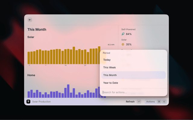 • Today Summary: an AI-generated 2–3 sentence plain-English explanation of the day's energy activity appears above the charts (requires Raycast AI; can be disabled in preferences)