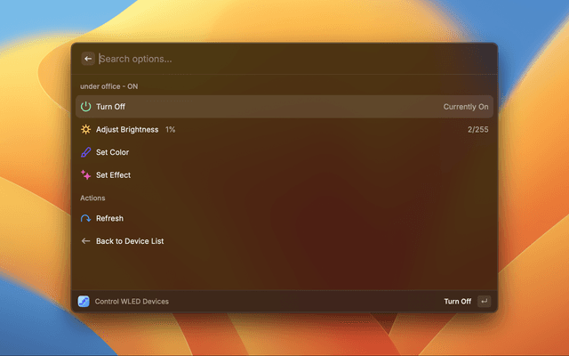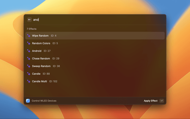Control your WLED LED strip devices directly from Raycast. Manage multiple devices, adjust colors, brightness, and apply effects with a simple, unified interface.