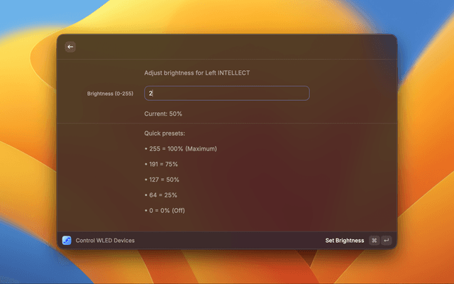 - Brightness Adjustment - Set brightness (0-255) with quick presets (25%, 50%, 75%, 100%)