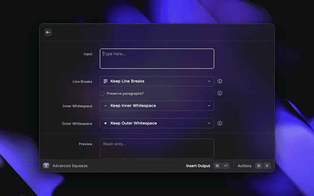 Text from external sources often comes with unwanted formatting: broken line breaks, excessive spacing, or awkward hyphenation. Squeeze helps you quickly clean it up with a few preset commands.