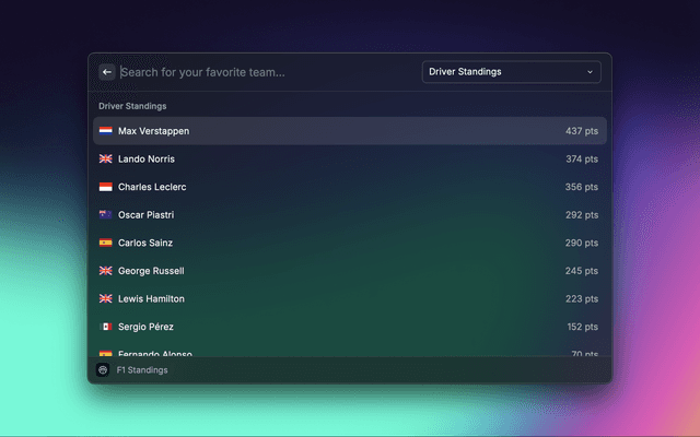 - Note: F1 does not support the favorite team dashboard command, but is still available in the preferences for use in the live scores menubar command