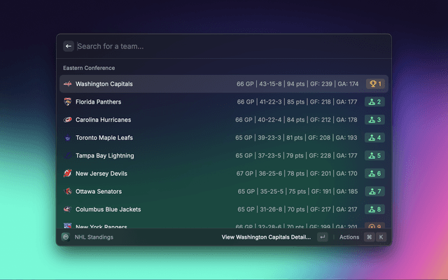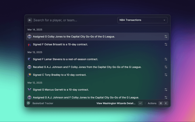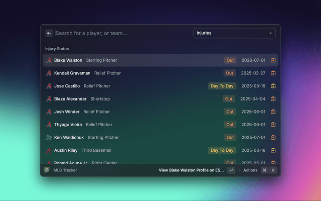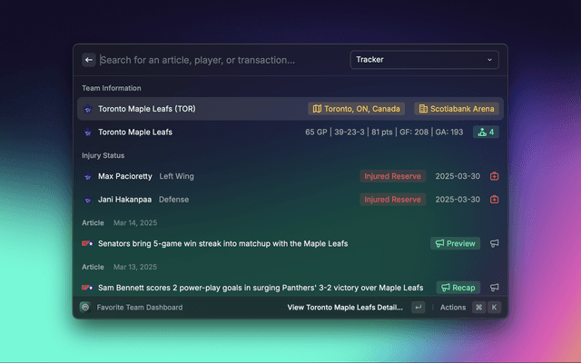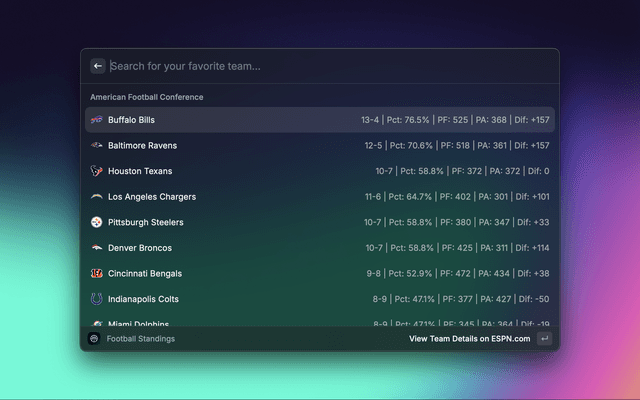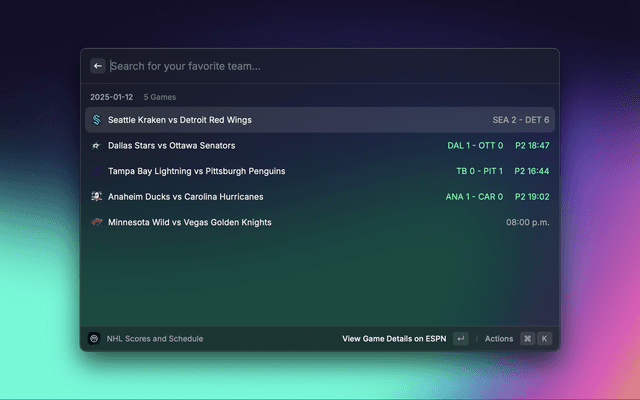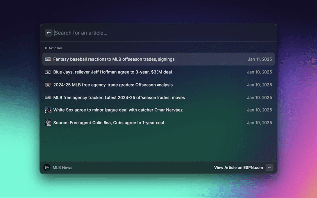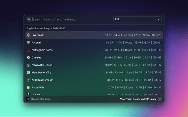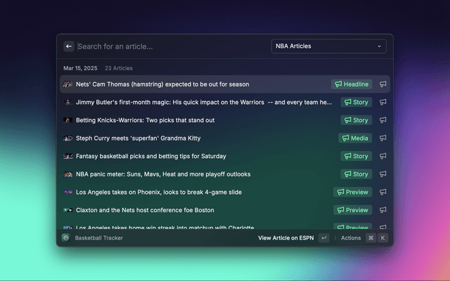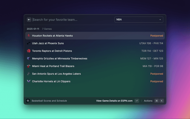 Sportssync is a raycast extension to view live scores, standings, injuries, transactions, and articles across your favorite sports leagues directly in Raycast.