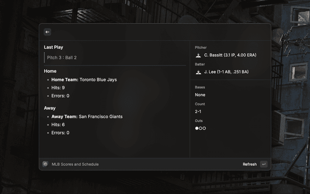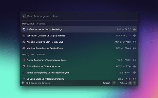 Live Scores Command (Menubar): View live scores and upcoming games, and click on games to set them as the menu bar title, allowing users to view scores with automatic refreshes.