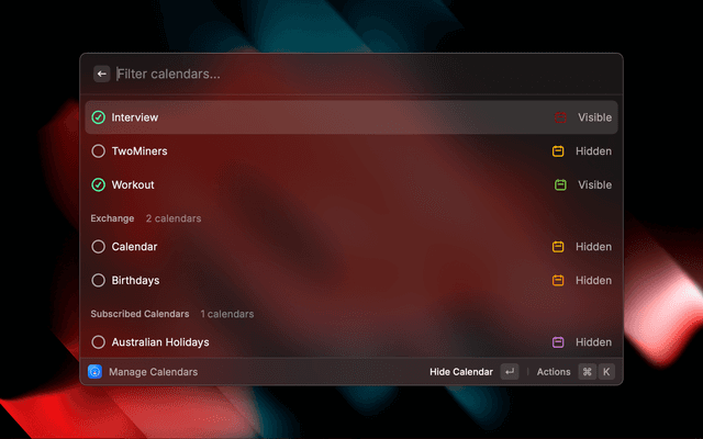 - With Raycast Pro: use natural language (e.g., "meetings last week", "Work calendar this month")