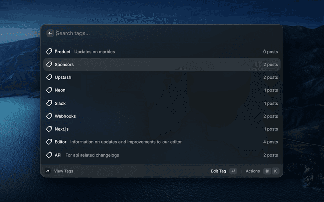- Tags — Browse, create, edit, and delete tags.
