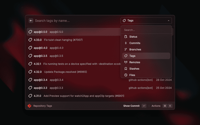 β + 1 to go to Statusβ + 2 to go to Commitsβ + 3 to go to Branchesβ + 4 to go to Tagsβ + 5 to go to Remotesβ + 6 to go to Stashesβ + 0 to go to FilesYou can create a Quicklink to open a specific repository without needing to select it in the Manage Git Repositories list.
