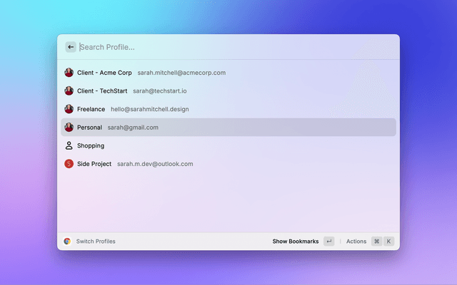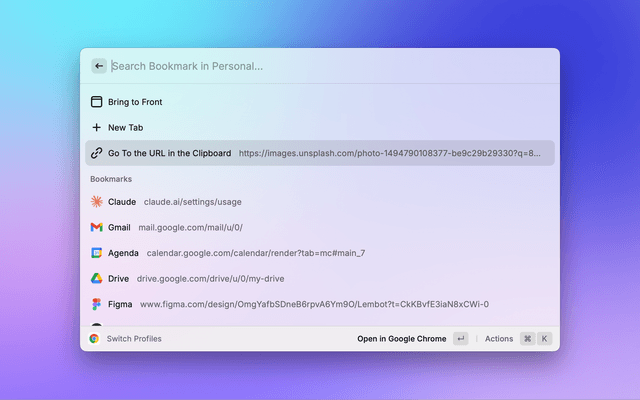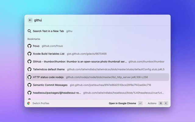Enter ↵to enter a profile's bookmarks,⌘ ↵to open (or focus) the profile chrome window, or⌘ ⇧ ↵to open a new window for the profile.