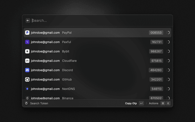 A Raycast extension that provides quick access to your OTP Auth tokens. This extension integrates with OTP Auth by Roland Moers, allowing you to view your 2FA codes directly from Raycast.