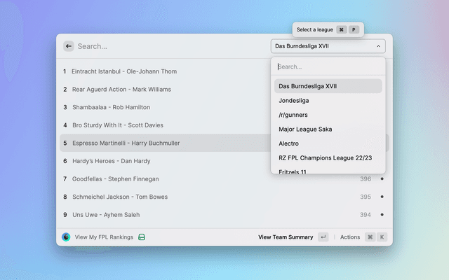 See where you rank amongst in your league rivals in Fantasy Premier League within Raycast.