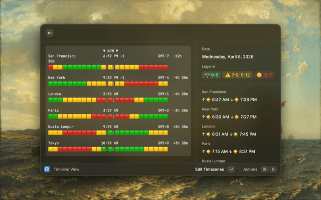 Cmd+E to add/remove cities← / → to shift time by your configured Arrow Key Scrub MinutesOption+← / Option+→ to shift by your configured Option+Arrow Key Scrub MinutesCmd+N to reset to current time| Shortcut | Action |