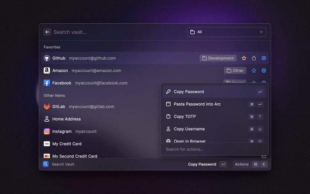 🔎 Search your vault 📋 Copy and paste any field 🔑 Generate passwords and TOTP codes ⭐ Mark items as favorites