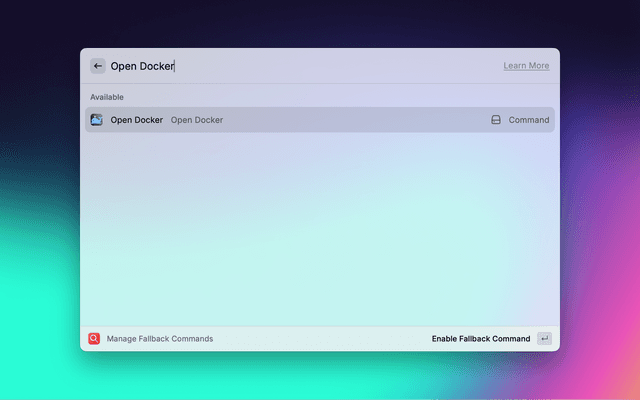 - You use Raycast to search for "Docker" and hit Enter.