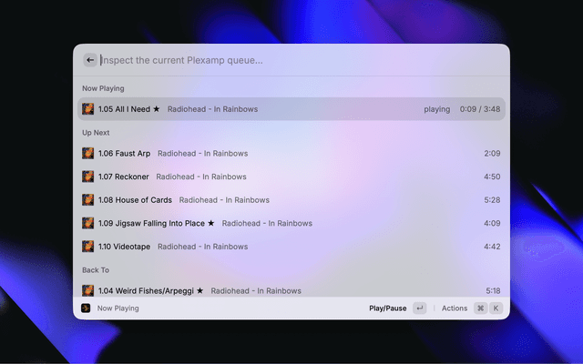 • Inspect the active Plexamp queue and use transport controls from Raycast in Now Playing.