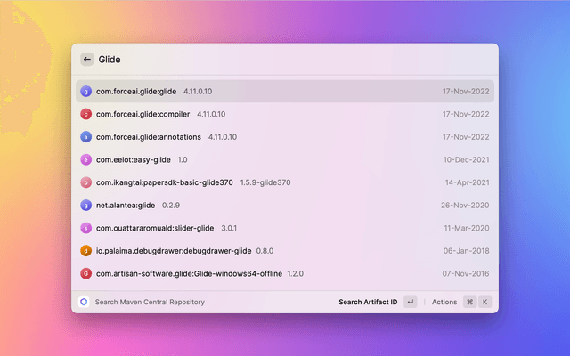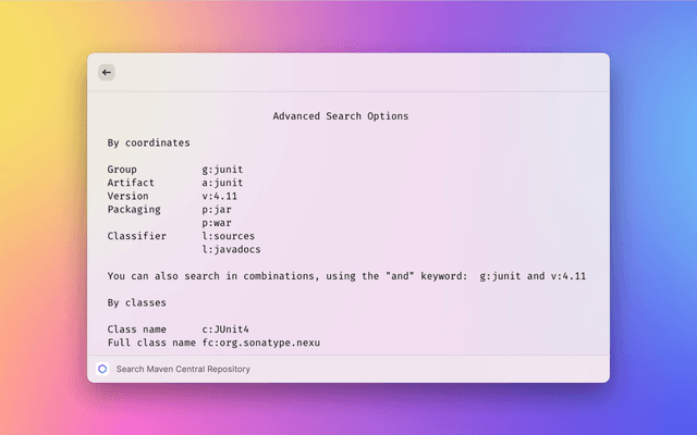 • Support for searching by groupId, artifactId, version, and classifier