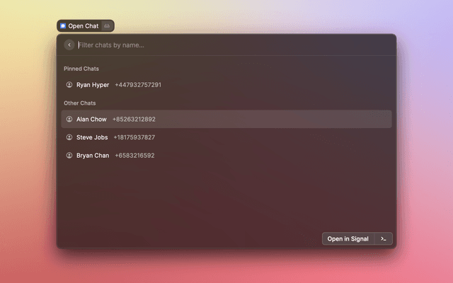 At the time of writing this, Signal does not offer a public API for users. It only provides application links to quickly access already existing chats. Until Signal provides a public API, the Add Chat commands will serve for adding the chats to the extension so users can access them from the Open Chat command.