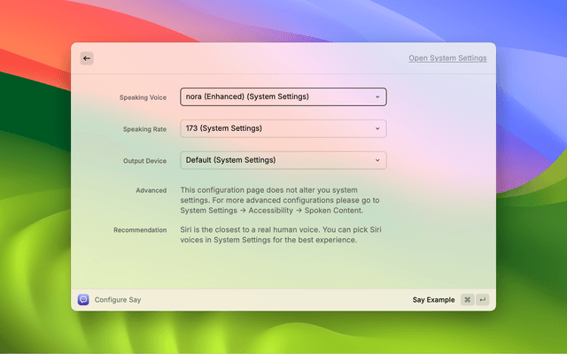 You can go to your macOS System Settings to download new voices and get more advanced configurations.
