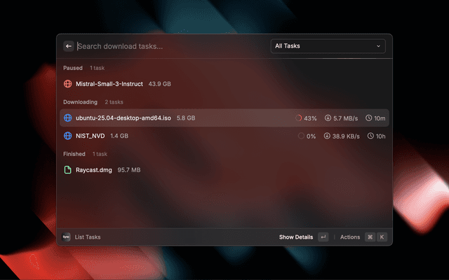 Manage your Synology Download Station tasks directly from Raycast. This extension provides a seamless interface to view, manage, and create download tasks on your Synology NAS without leaving Raycast.