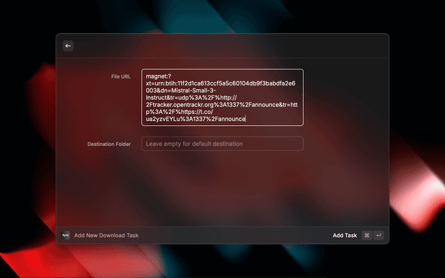 • Support for HTTP/HTTPS URLs, FTP URLs, and magnet links