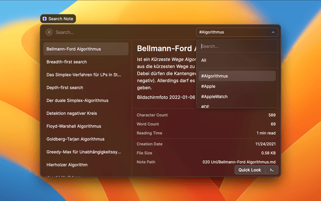 This command allows for quick access to all of your notes. By default you can search notes by title. Enabling content search in the commands preferences allows you to search for notes by their content and title. If there doesn't exist a note with the title you searched for you can create a new note with that title right from the command. Use the tag filter in the top right corner to filter notes based on their tags (both YAML frontmatter and inline tags).