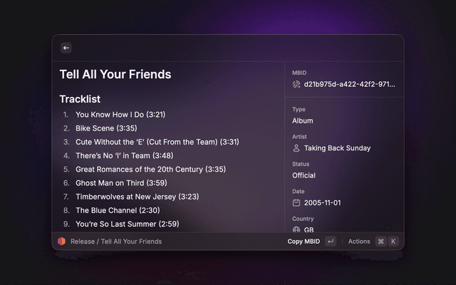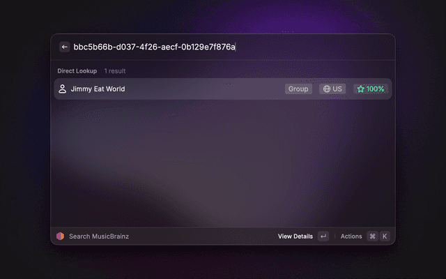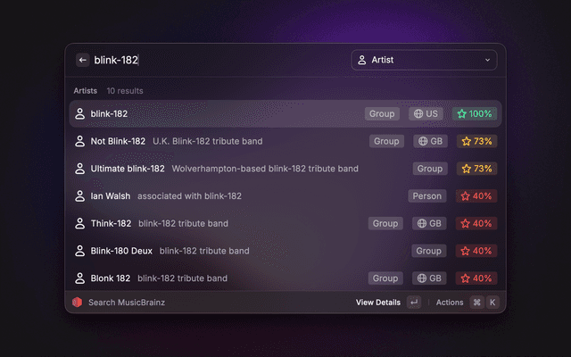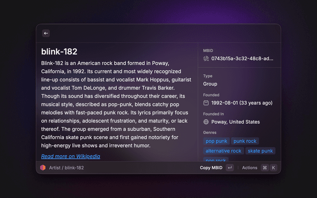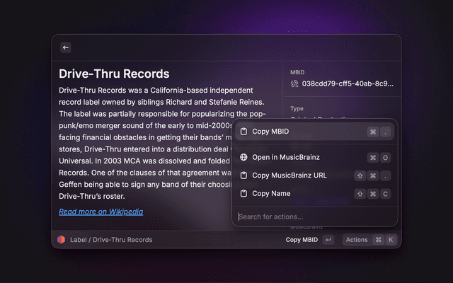 Search MusicBrainz for artists, releases, recordings, release groups, labels, and works. View detailed information including discographies, tracklists, cover art, and Wikipedia summaries. Quickly copy MBIDs and other identifiers. Lookup an entity by pasting a MusicBrainz URL or MBID.