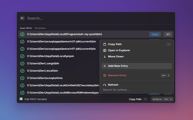 • Edit PATH — Dedicated PATH editor with drag-to-reorder, existence validation, and duplicate detection
