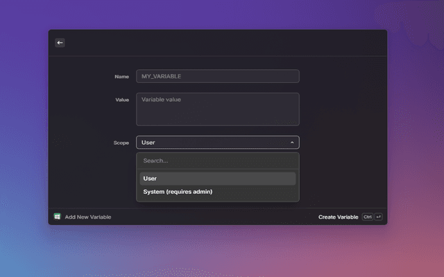 • Add Variables — Create new environment variables with scope selection (User or System)