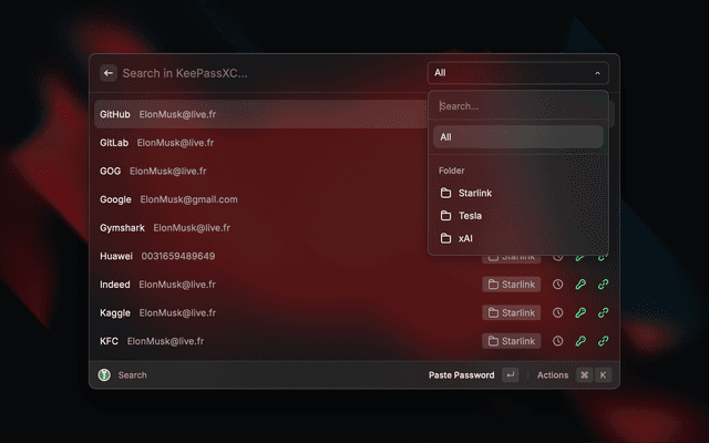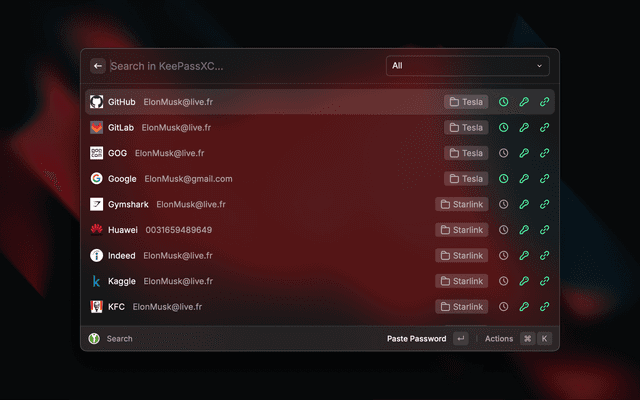 Search your passwords, usernames, TOTP codes, and more using KeePassXC directly from Raycast.