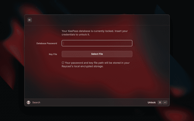 Your credentials required to access your KeePass database, which include a password and an optional key file, are securely stored in Raycast's local encrypted database. This storage prevents other extensions from accessing the storage of that extension.