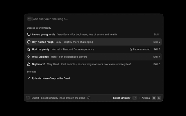 Play the classic first-person shooter DOOM directly in Raycast, rendered entirely in ASCII art. Experience the legendary 1993 game with episode selection, difficulty levels, and real-time player statistics.