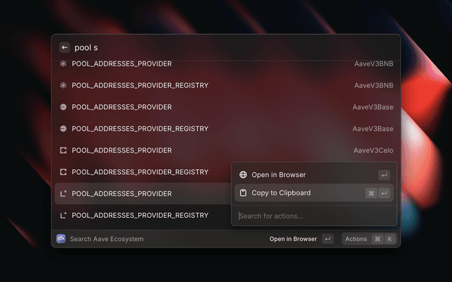A Raycast extension that provides quick access to official Aave ecosystem smart contract addresses across multiple networks.