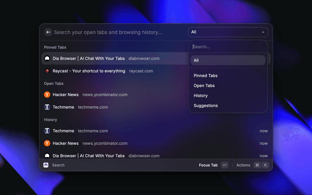 Search and quickly navigate your Dia browser's history and open tabs from anywhere on your Mac. You can open recent tabs in Dia or other browsers as well as copy websites to quickly share them.