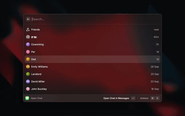 Another weird one. Group chats with a name can't be opened from Raycast. Why? Because the sms:// URL scheme doesn't support opening them by name or ID. While it's technically possible to open them with all the participants' phone numbers, this would create a new group chat besides the existing one that actually has a name.