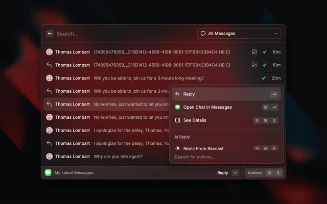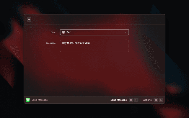 If you try to open the chat from Raycast, it'll actually open the following URL: sms://open?addresses=1234567890,9876543210 which will cause the creation of a new group chat without a name (Alice and Bob). You wouldn't want to bother your friends or family with a new group chat, would you? 😄