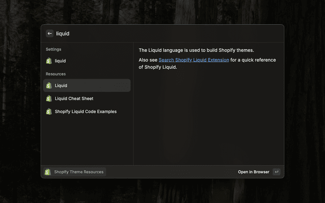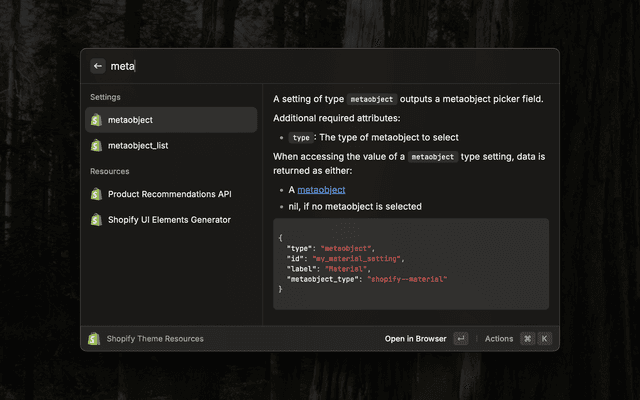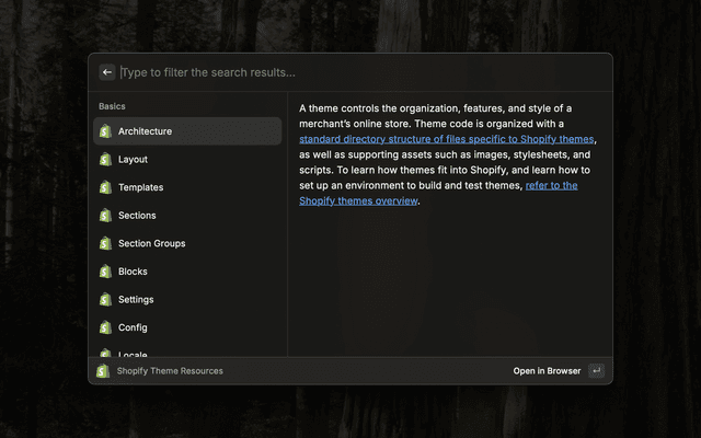 Quickly reference and search Shopify theme resources, like input settings, fonts, and more for Shopify theme development.