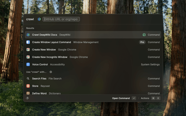 - Search DeepWiki Repos: Search for repositories indexed by DeepWiki directly within Raycast.