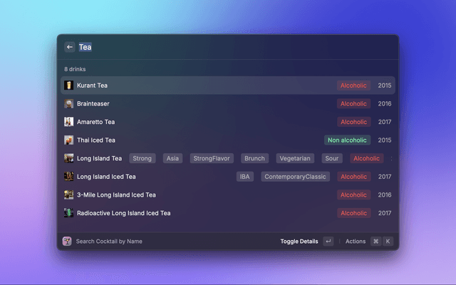This is a Raycast extension to get a Cocktail by its Name or Ingredient using https://www.thecocktaildb.com/api.php. An API Key is not required but the Free version is limited to 25 items at a time. If you need more features, you can subscribe to their Patreon to get a paid API Key. You can then enter this API Key in Preferences.