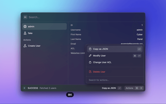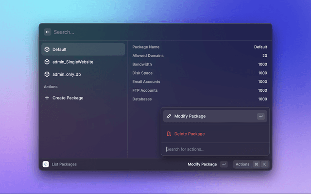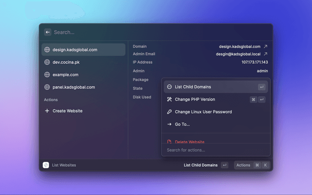 This is a Raycast extension for CyberPanel. With this extension you can manage Users, Packages, Websites, Child Domains, Backups, Databases, Email Accounts, DNS Records and FTP Accounts in CyberPanel using CyberPanel Cloud API (documentation link).
